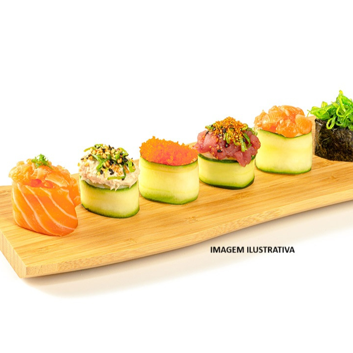 4 hossomakis de salmão, 4 hossomakis de pepino, 4 hossomakis de kani, 2 niguiris de salmão maçaricado, 2 niguiris de salmão, 4 niguiris de skin, 3 Joes de pepino com salmão e cebolinha, 3 Joes de pepino com atum, pimenta togarashi e cebolinha, 2 uramakis de skin e 2 uramakis de salmão e cebolinha. (600 g) - **Obs.: não é possível realizar trocas de peças *Obs.: não acompanha hashi, berço e shoyu