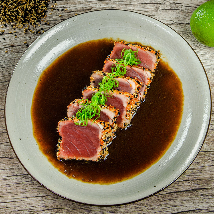 Porção de 100gr de sashimi de atum selado com crosta de gergelim mix. Acompanha molho tataki. *Obs.: não acompanha hashi, berço, shoyu, wasabi e gengibre.
