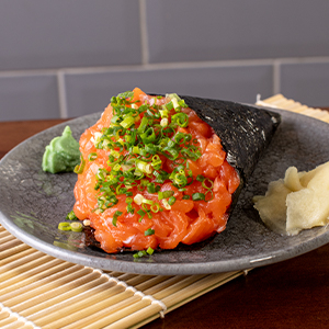 Salmão temperados com molho especial, servidos com tortilha de milho que adicionam um toque crocante ao prato. A base é cream cheese. (120gr) *Obs.: não acompanha hashi, berço, shoyu, wasabi e gengibre.