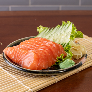 Porção de 100gr de sashimi de salmão cru. *Obs.: não acompanha hashi, berço e shoyu