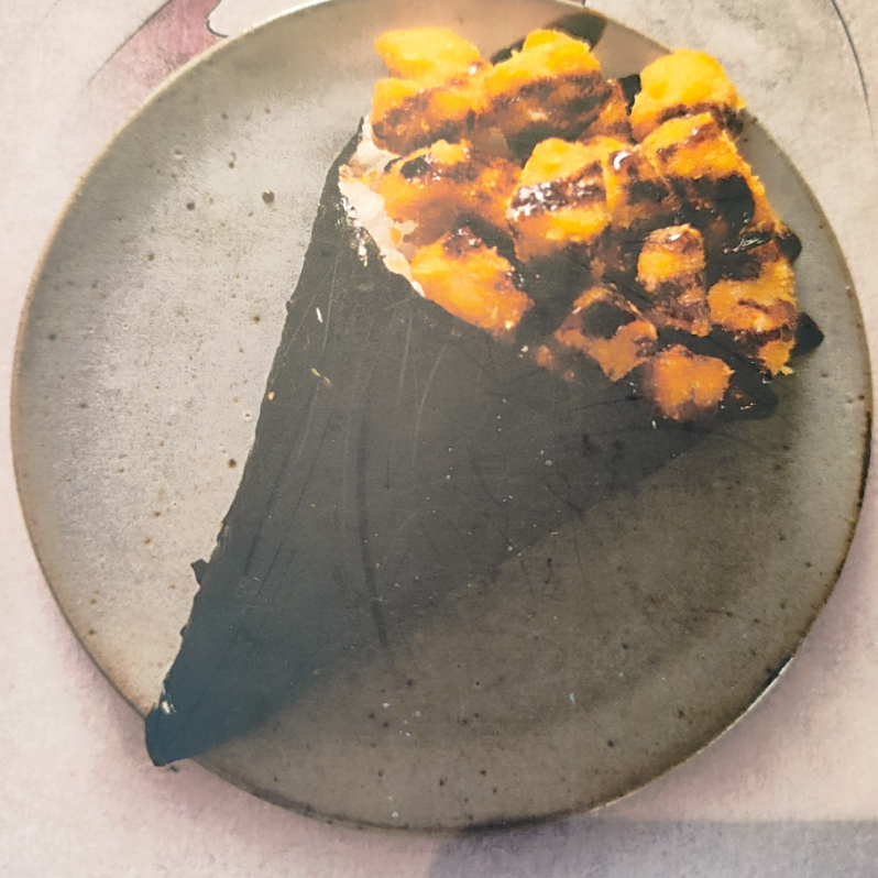 6unidades de sushi empanado e frito, recheado com salmão assado, cream cheese e couve crispy. Acompanha molho tarê. *Obs.: não acompanha hashi, berço, shoyu, wasabi e gengibre