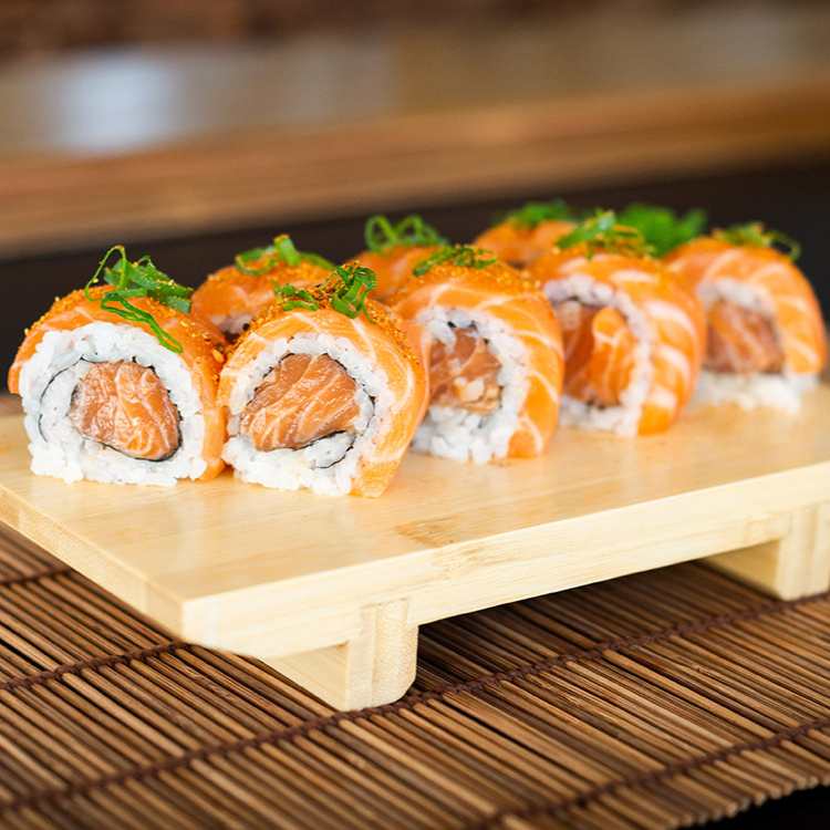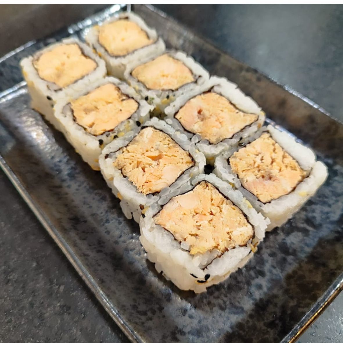 8 peças de uramaki de salmão cru enrolado em uma fina fatia de barriga de salmão, coberto por maionese picante e pimenta togarashi. *Obs.: não acompanha hashi, berço, shoyu, wasabi e gengibre