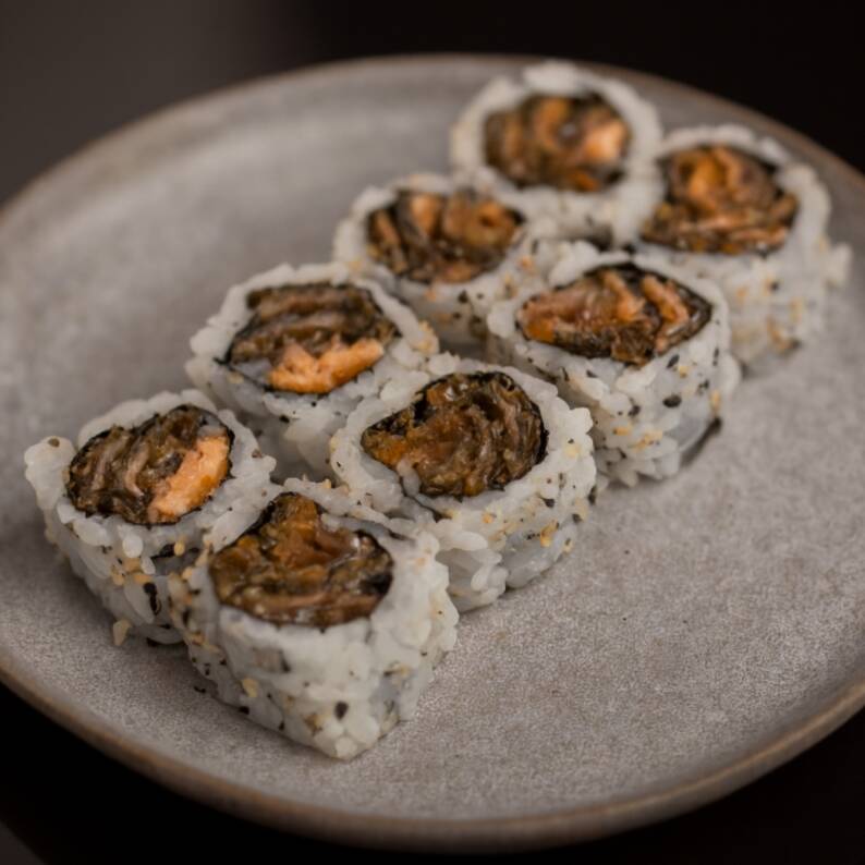 8 unidade de uramaki de Pele de salmão assada. *Obs.: não acompanha hashi, berço e shoyu