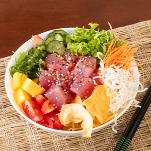 400gr de um mix refrescante composto por arroz japonês temperado, atum ,manga, wakame, bifum crispy, cenoura, sunomono, alface, tomate cereja, gergelim e chips de batata doce. Acompanha molho ponzu *Obs.: não acompanha hashi, berço, shoyu, wasabi e gengibre.