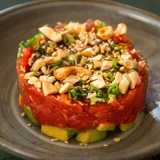 Atum temperados em molho Picante adocicado, servidos com abacate, cebolinha, castanha de caju, gergelim e batata doce chips (180gr). *Obs.: não acompanha hashi, berço, shoyu, wasabi e gengibre.