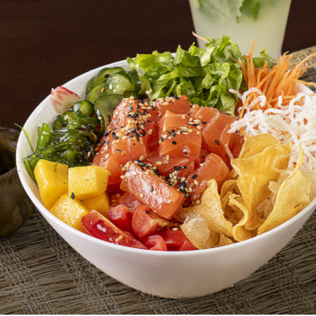 400gr de um mix refrescante composto por arroz japonês temperado, salmão cubos empanado e frito,manga, wakame, bifum crispy, cenoura, sunomono, alface, tomate cereja, gergelim e chips de batata doce. Acompanha molho ponzu. *Obs.: não acompanha hashi, berço, shoyu, wasabi e gengibre. *imagem ilustrativa