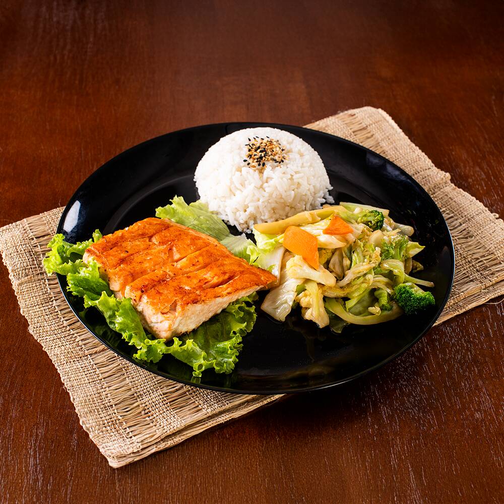 Filé de salmão grelhado, acompanha arroz japonês com gergelim e legumes refogados (400gr). Porção de 100gr de finas fatias de salmão servidas com cebolinha e molho citrico ponzu. *Obs.: não acompanha hashi, berço, shoyu, wasabi e gengibre.