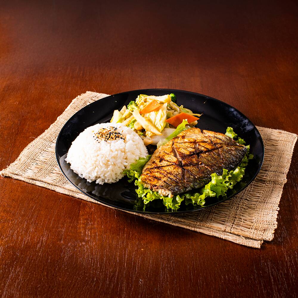 Filé de anchova grelhada, acompanha arroz japonês com gergelim e legumes refogados (400gr).Porção de 100gr de finas fatias de salmão servidas com cebolinha e molho citrico ponzu. *Obs.: não acompanha hashi, berço, shoyu, wasabi e gengibre.