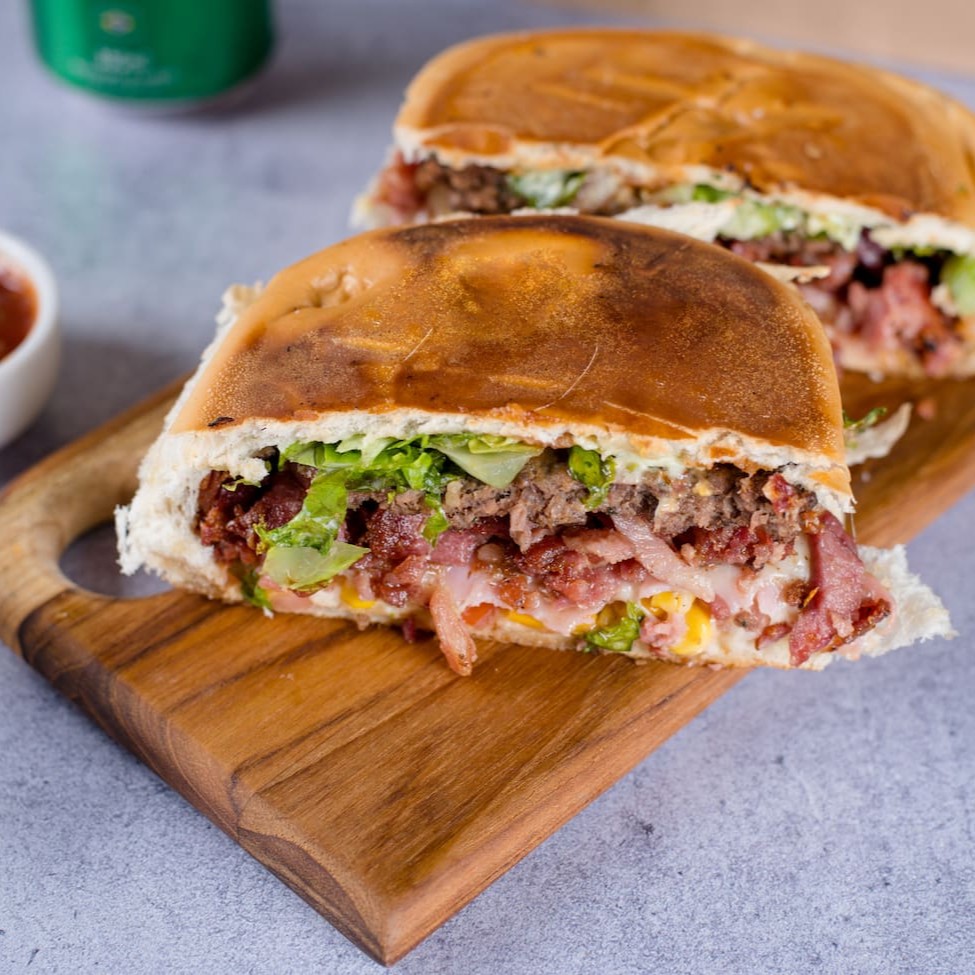 Hambúrguer, Bacon, Presunto, Queijo, Alface, Tomate, Milho, Maionese Caseira e Ketchup.