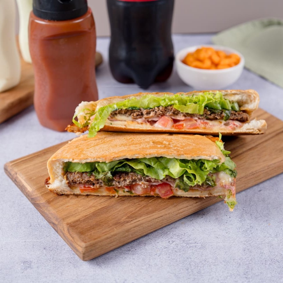 Hambúrguer, 2 Queijos, Alface, Tomate, Maionese Caseira e Ketchup.