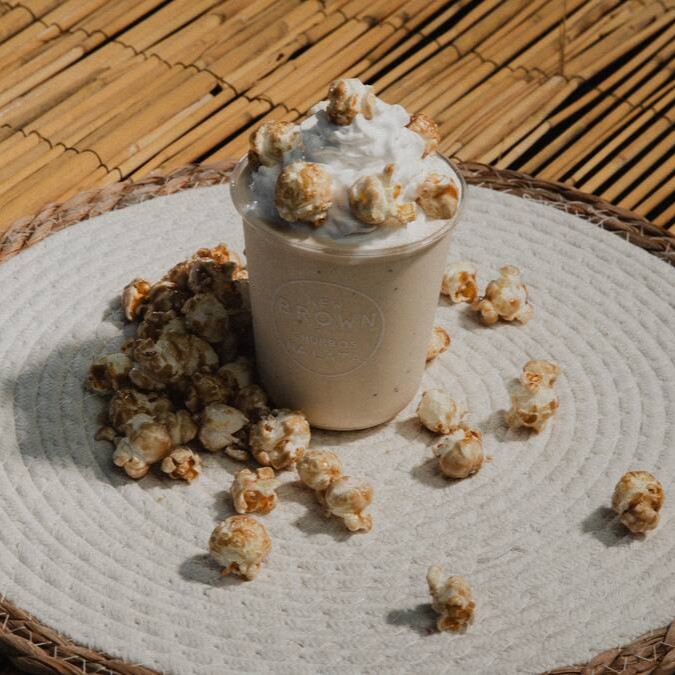Milk Shake com sorvete de creme, Monin Pipoca, Pipoca Mais Pura Caramelo e Flor de Sal e Chantilly.