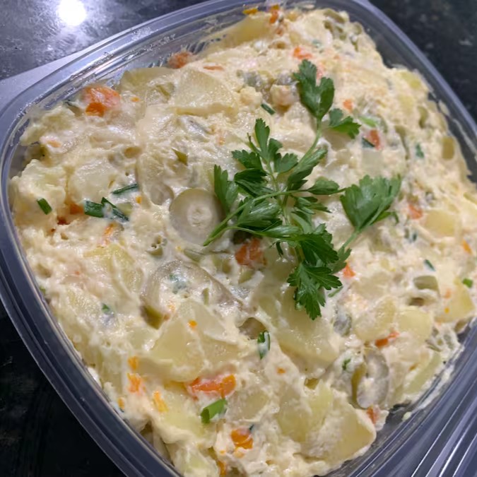Maionese bem temperada e saborosa com legumes cozido do dia , finalizada com cheiro verde e azeitona fatiada , mega saborosa.