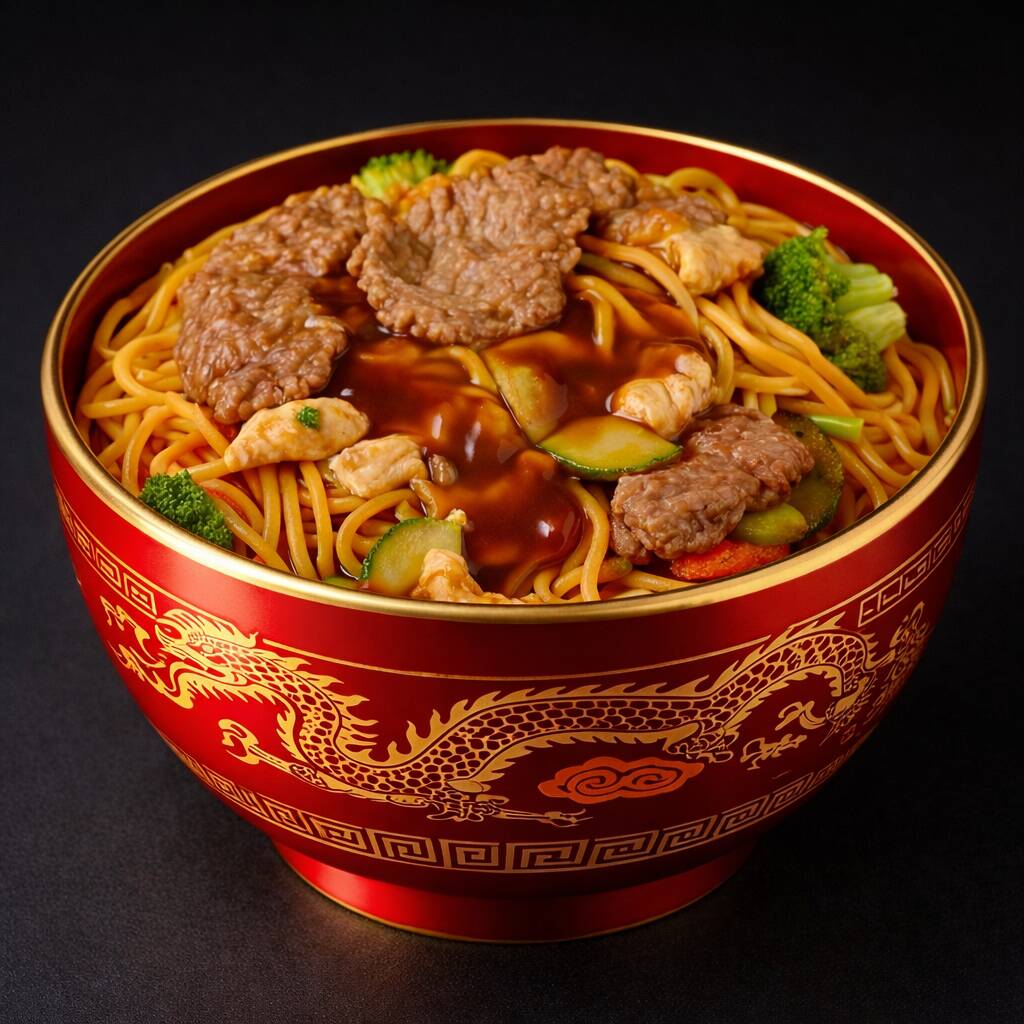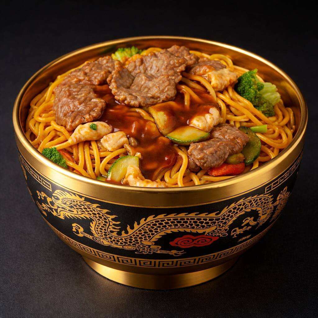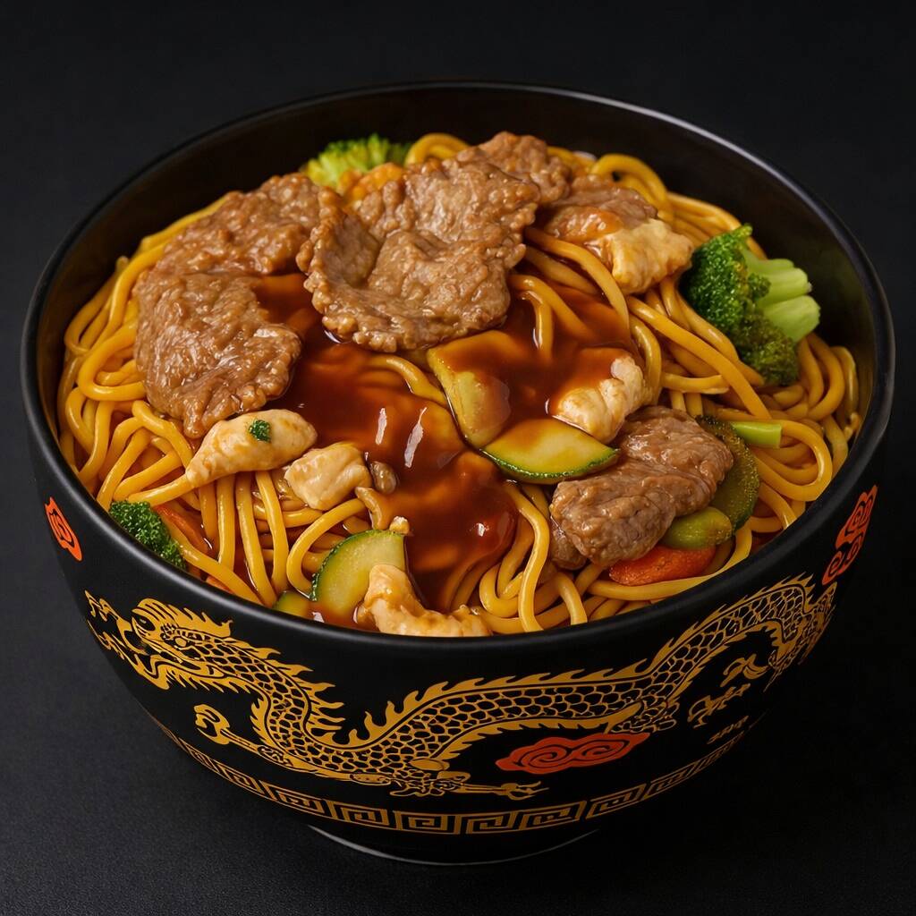 Se permita a um sabor inigualável de uma mistura de macarrão oriental, contra filé e frango juntos em sua quantidade perfeita, extraindo o que a de melhor. Acompanha suculentos legumes e vegetais frescos, grelhados na manteiga em uma exuberante experiência gastronômica. Um toque especial de molho com temperos orientais em uma explosão de sabores e além de ser rica em nutrientes de qualidade. Experimente e deixe-se conquistar!