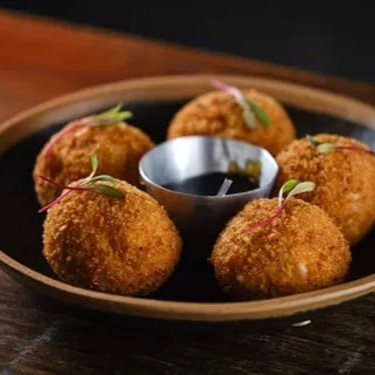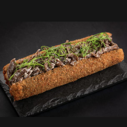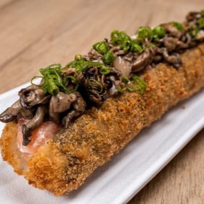 Bolinho recheado com cream cheese, shimeji, empanado e frito.. Finalizado com tare.