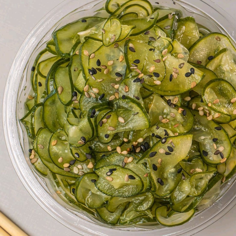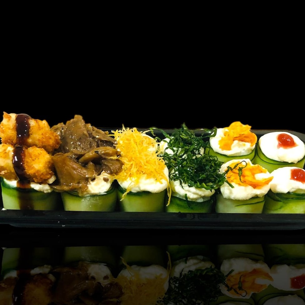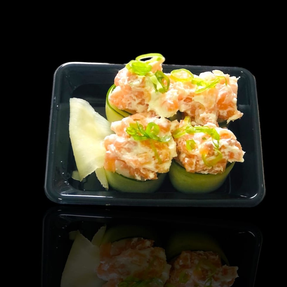Pepino enrolado na bolinha de arroz e salmão batido com cream cheese e cebolinha.
