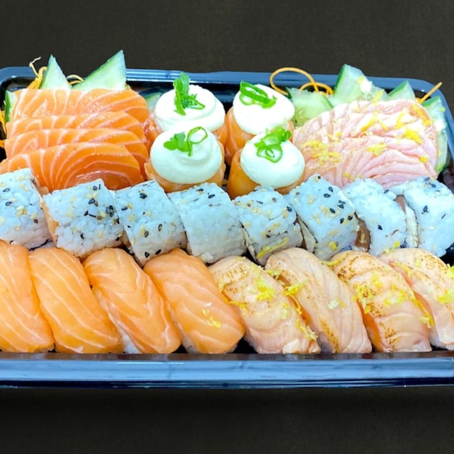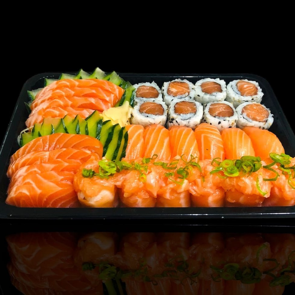 4 sashimi salmão 4 sashimi maçaricado com raspas de limão 4 niguiri salmão 4 niguiri maçaricado com raspas de limão 8 uramaki salmão philadelfia 4 joy salmão cream