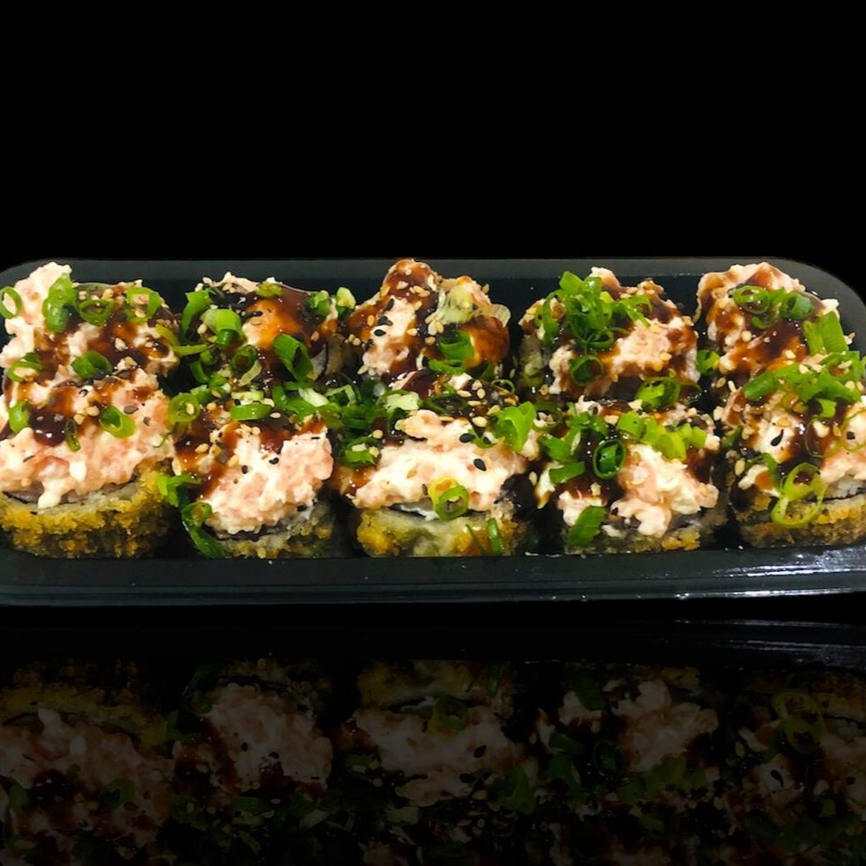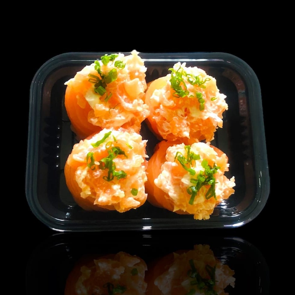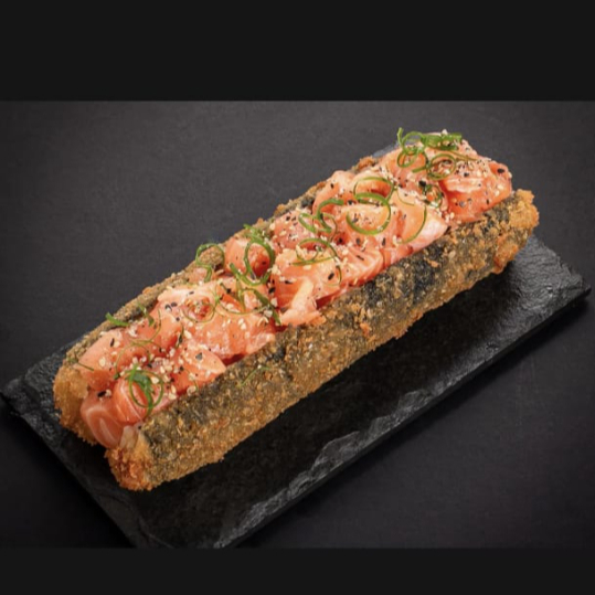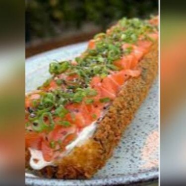 Base de arroz empanado e fritado com cream chesse, recheado com salmão cru, cream cheese, cebolinha e finalizado com tarê e gergelim..