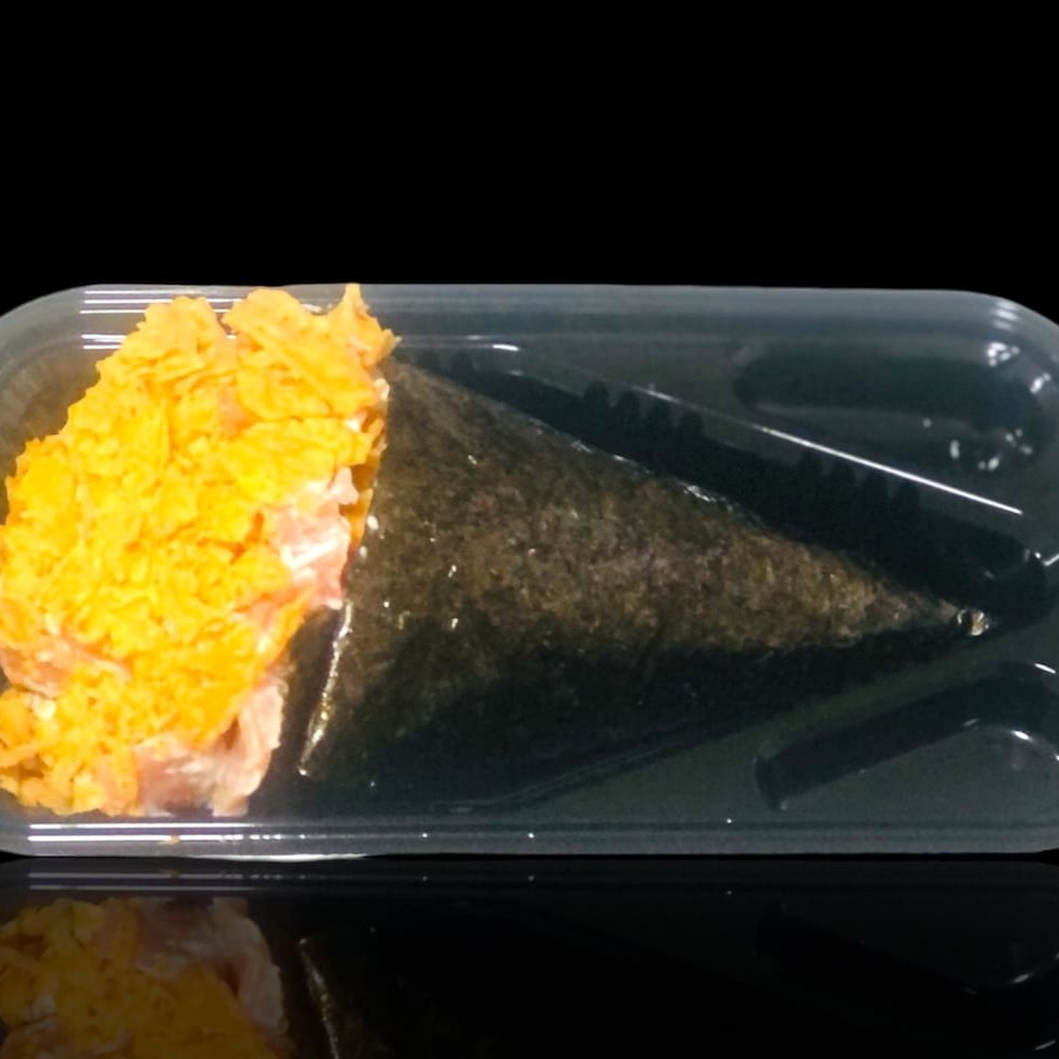 Salmão enrolado na bolinha de arroz, cream cheese e crispy de batata doce.