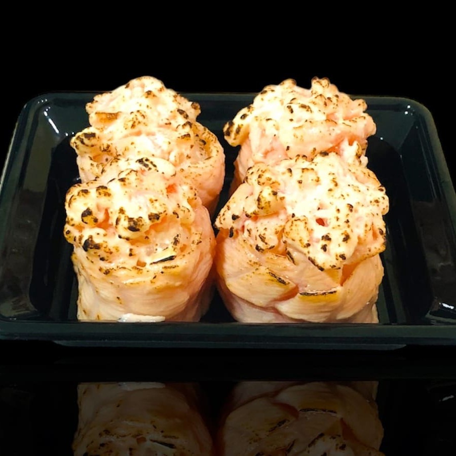 Salmão enrolado na bolinha de arroz levemente maçaricado.