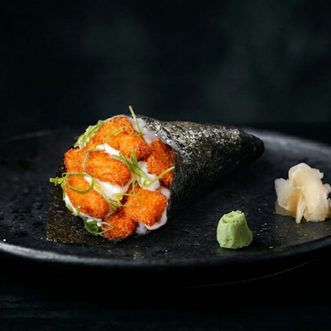 Temaki de salmão grelhado, cream cheese e cebolinha, empanado e frito.