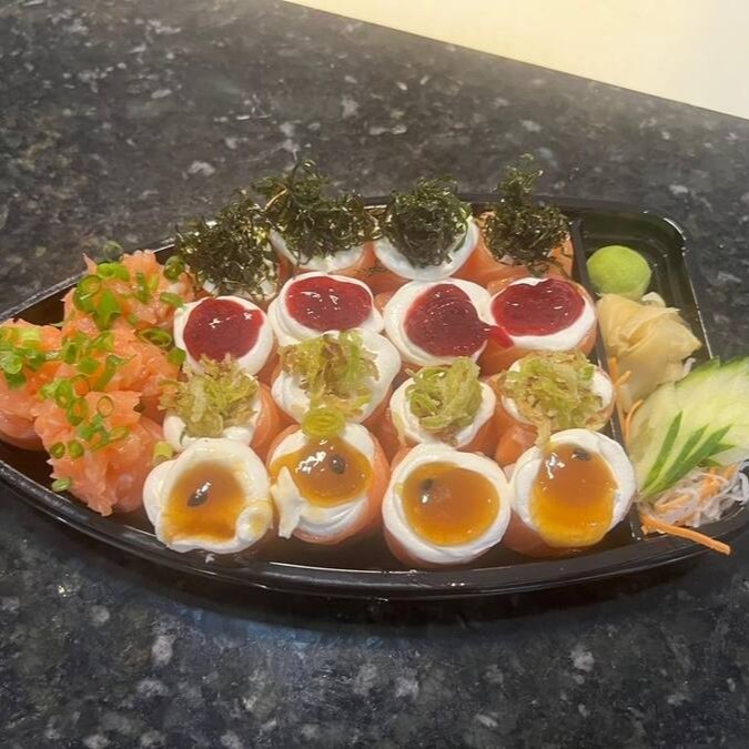 5 Fatias De Sashimi A Escolha + 2 Hossomaki De Pepino + 2 Hossomaki De Salmão + 2 Uramaki De Salmão Grelhado + 2 Niguiri De Salmão + Sunomono + Ceviche + Shimeji Ou Anchova. Obs: Sem Modificações