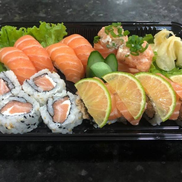 4 uramaki Philadelphia 4 hossomaki de salmão 4 hossomaki de salmão grelhado 4 niguiri de salmão 10 unidade de hot roll com cream cheese.