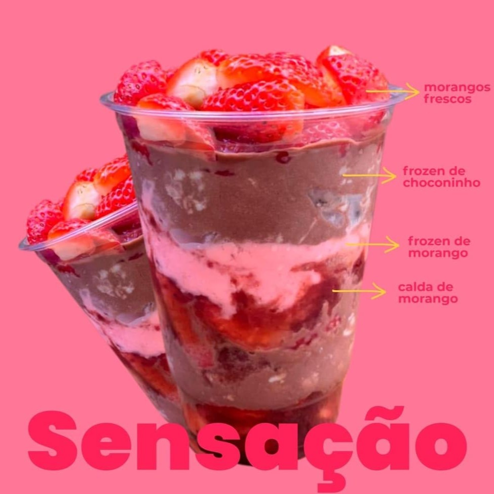 Que Sensação Ma-Ra-Vi-Lho-Sa, e melhor, em várias camadas! É de dar água na boca! Frozen de Choconinho + Calda de Morango + Morangos Frescos + Frozen de Morango!!! Hum... E repete a camada novamente... >Nossa missão é levar o melhor produto, e para manter o seu Sensação em perfeitas condições, enviaremos em nossas queridíssimas e eficientes embalagens térmicas, tá!? Todos os nossos frozens são
