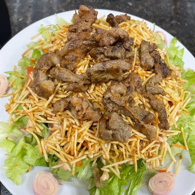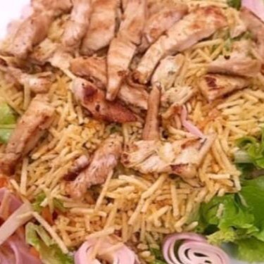 Deliciosa salada com Alface tomate cenoura batata palha presunto mussarela molho rose.
