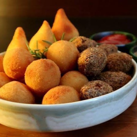 Salgados sabores: coxinha, bolinha de queijo, presunto e queijo, croquete de calabresa e kibe.
