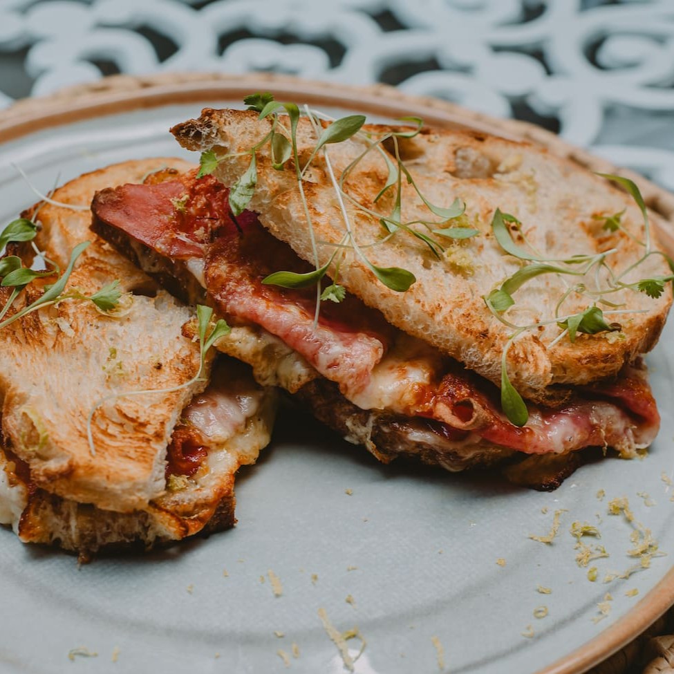Pão de casa, mussarela e presunto royale tostado na chapa.