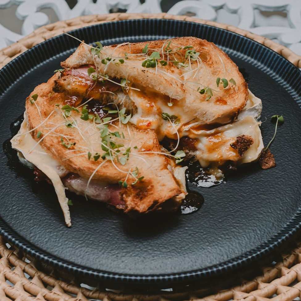 Nosso pão da casa recheado com queijo Brie cremosíssimo e presunto parma Tessinês. Acompanha porção de geleia de pimenta artesanal