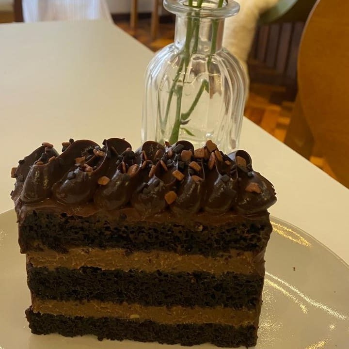 Fatia de bolo de brigadeiro belga trufado. São 3 camadas de puro sabor.