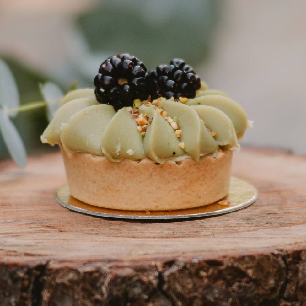 Tarte recheada com compota de amora e coberta com brigadeiro de pistache italiano