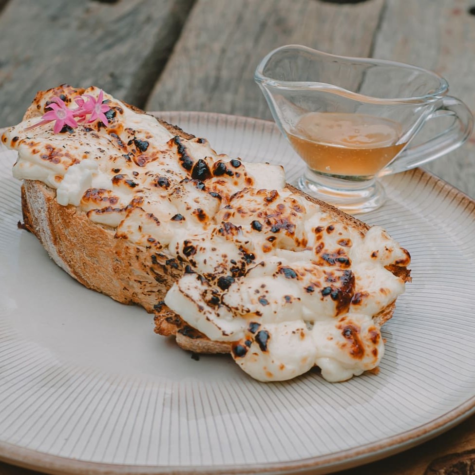 Pão de casa com queijo minas tostado. Acompanha mel.