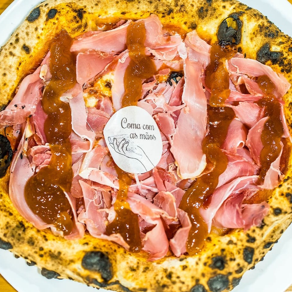 Molho de tomate pelado italiano, muçarela fresca Fior Di Latte, presunto Parma e geleia de damasco.