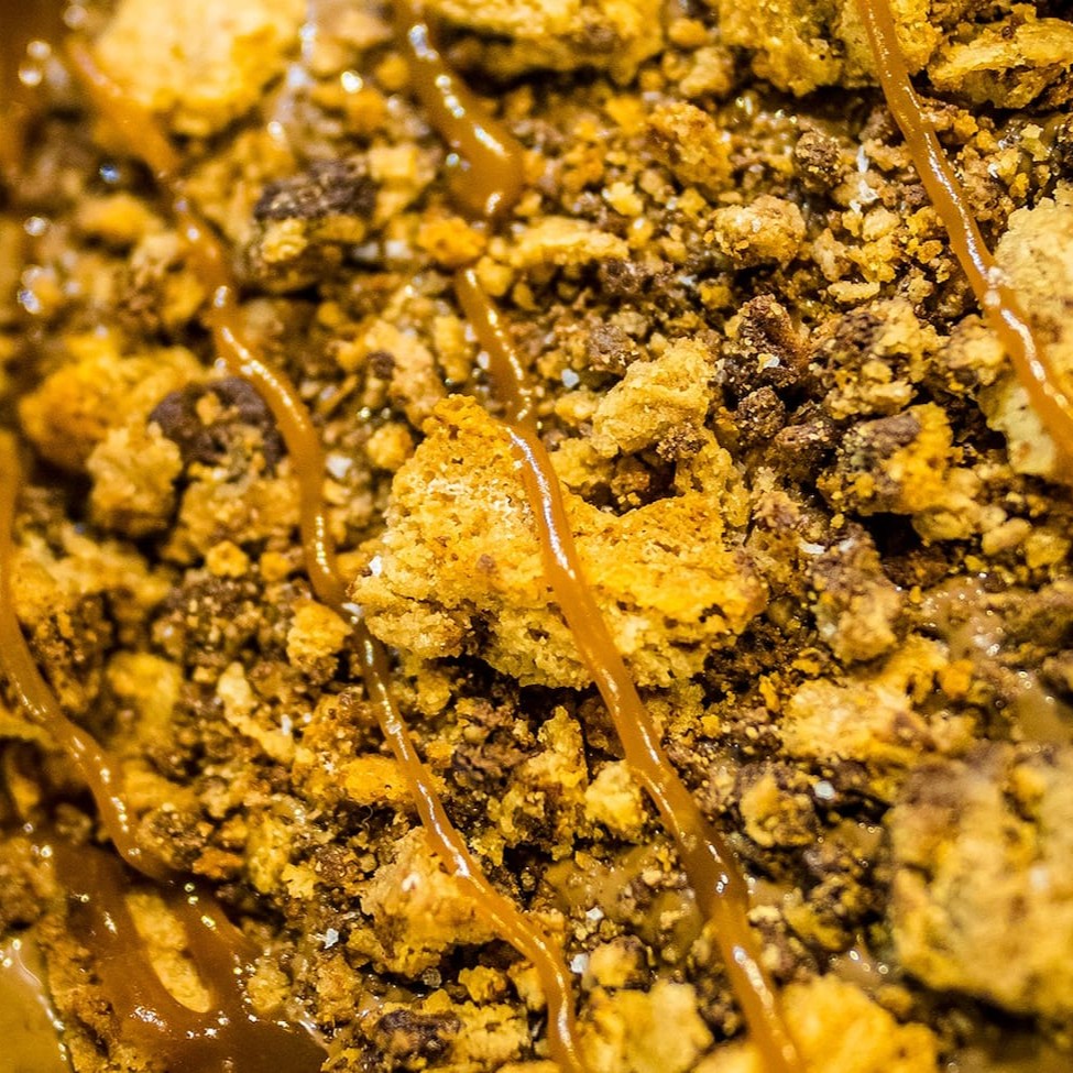 Base com creme de leite fresco,creme de avelã, finalizada com cookies artesanais de chocolate e fios de caramelo salgado.