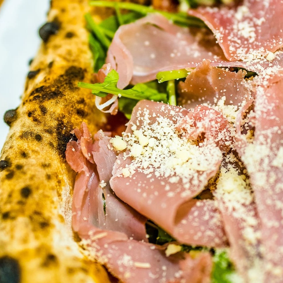 Molho de tomate pelado italiano, muçarela fresca Fior Di Latte, parmesão, presunto parma, finalizada com folhas frescas de rúcula.