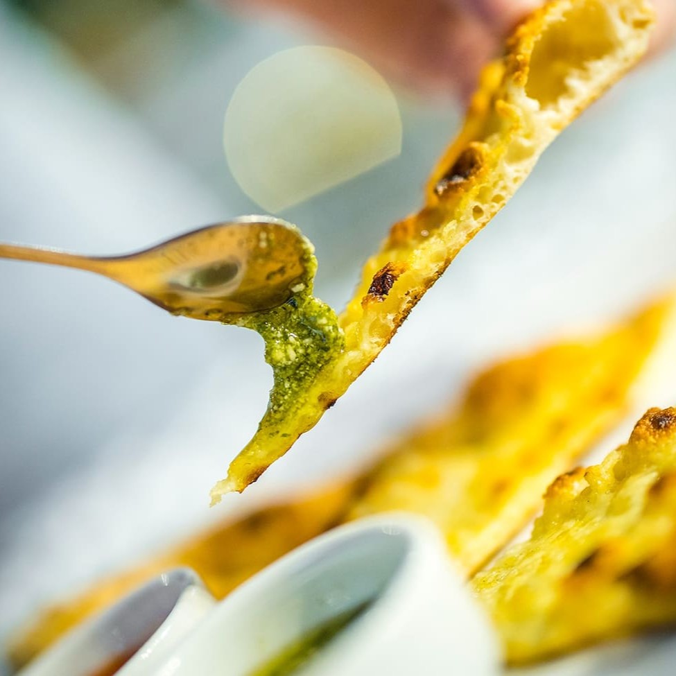 Massa de pizza com toque de parmesão. Acompanha molho pesto e molho de tomate pelado italiano.