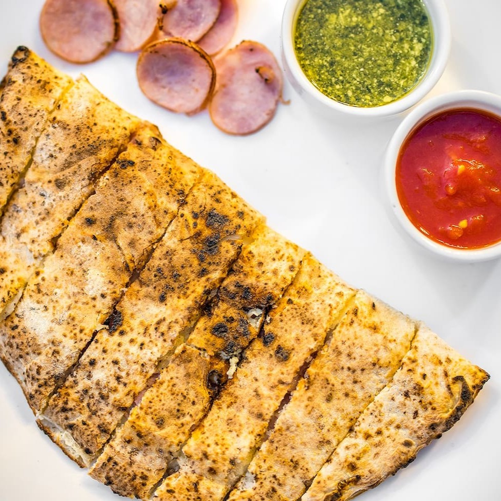 Massa de pizza recheada com parmesão e muçarela Fior de Latte. Acompanha molho pesto e molho de tomate pelado italiano.