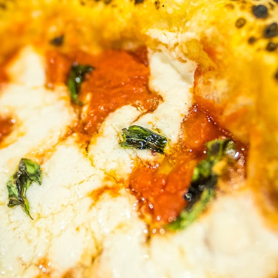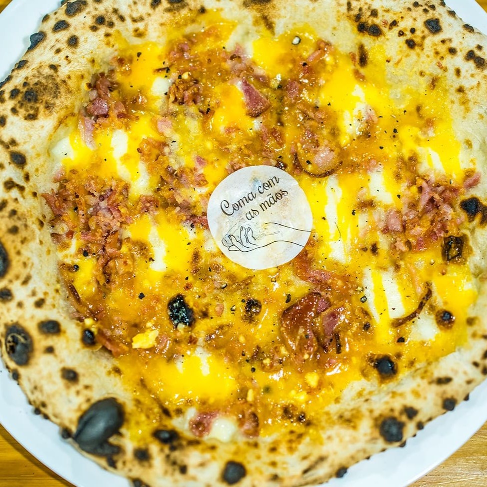 Muçarela fresca Fior Di Latte, bacon artesanal, parmesão, finalizada com fios de gema, queijo pecorino e pimenta do reino.