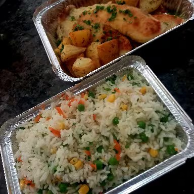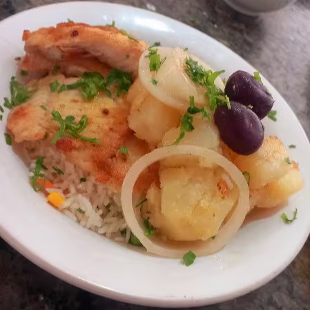 Filé grelhado, coberto com cebolas , batatas ao murro e azeitonas puxados no azeite e ch verde salteado!!! Acompanha arroz à grega (milho, ervilhas, cenoura , manteiga e ch verde)