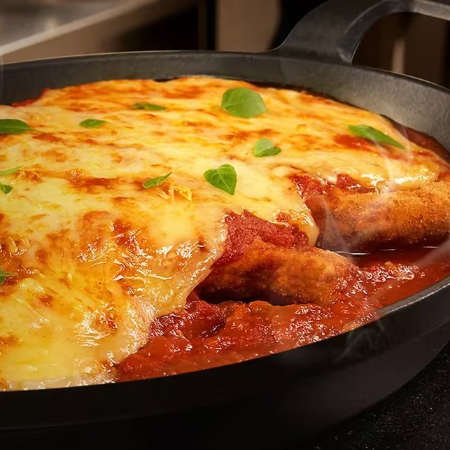 Filé a milanesa, cobeto com molho ao sugo e muçarela gratinada, acompanha arroz branco e batata rústica temperada com tomilho, orégano e pimenta calabresa seca!