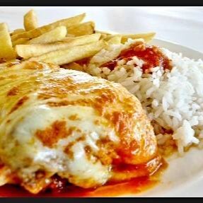 Filés de Tilápia empanados e fritos, cobertos com muçarela, molho de tomate ao sugo e parmesão gratinado. Acompanha arroz branco e batata rústica temperada com chimirrurri!!!