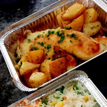 Filé de peixe sem espinho empanado e frito. Acompanham arroz à grega(ervilhas, milho e cenoura ralada), batata rústica (temperada com chimichurri) e molho tártaro.