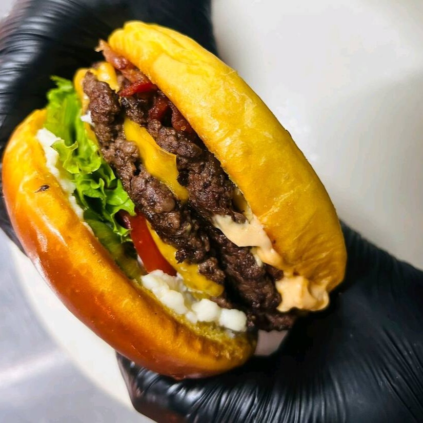 Pão brioche , 2 hambúrguer 70g, bacon, Catupiry molho da casa, alface,tomate e queijo prato