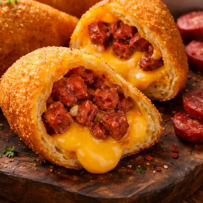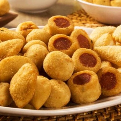 Delicioso salgado frito de calabresa com cheddar, suculento, cremoso, sabor marcante.