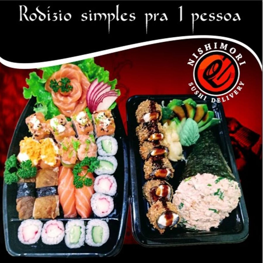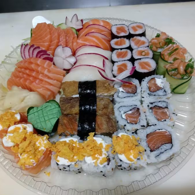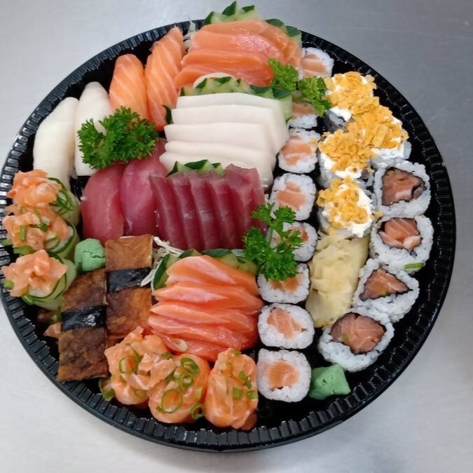 20 fatias de sashimi variados, 8 niguiris variados, 6 jows 8 uramakis ( 4 de salmao, 4 de Doritos ) 8 hossomaki de salmao, 1porção de hot rolls, e 1 porção de carpaccio de salmao.