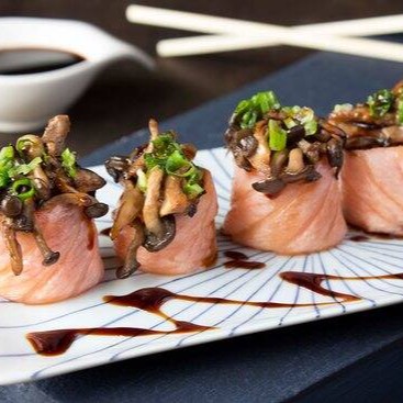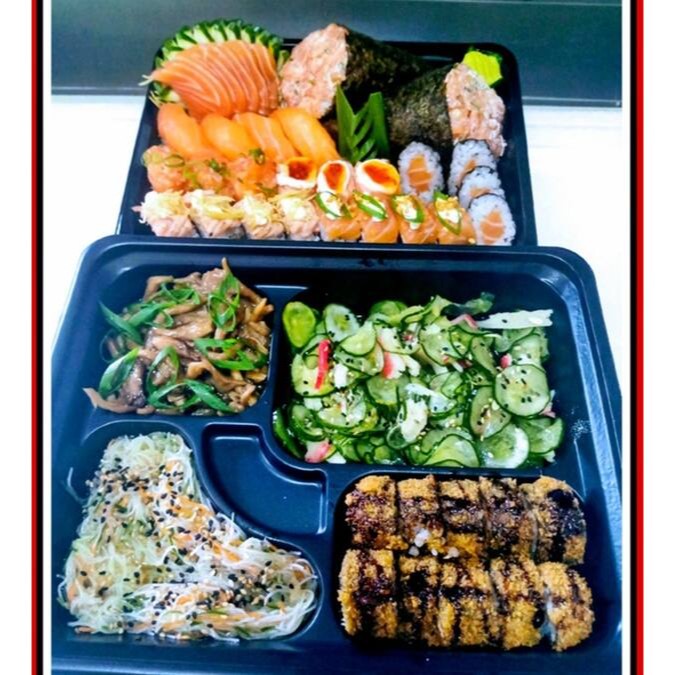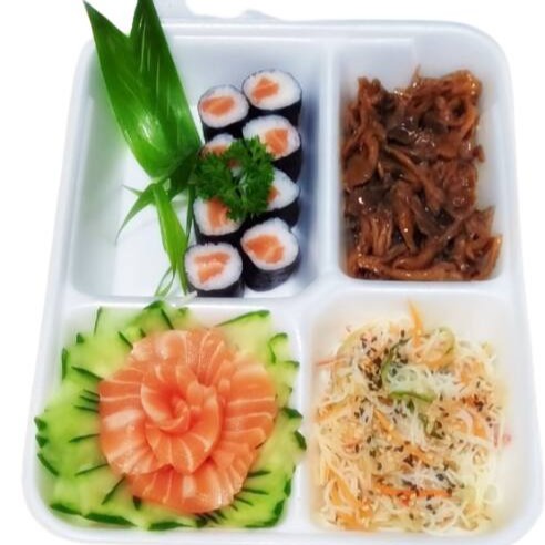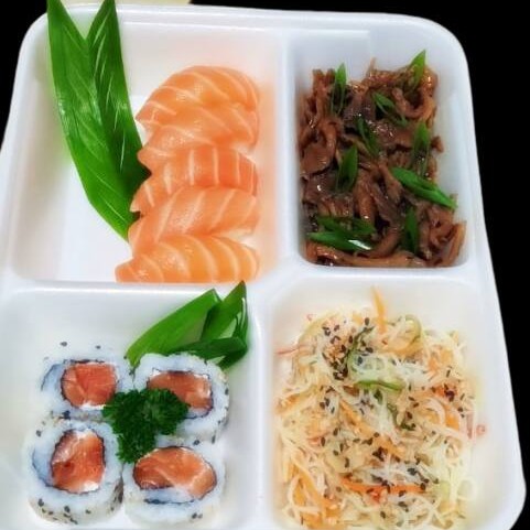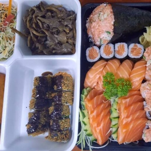 10 sashimi de salmao ( 3 niguiri salmao, 3 niguiri skin, 3 niguiri peixe branco, 4 uramaki salmao, 4 uramaki skin, 10 unidades de hot roll, 1 shimeji, 1 bifun, 1 sunomono e 6 jow variados) ganhe 8 hossomaki de salmao, porção de lula empanada.