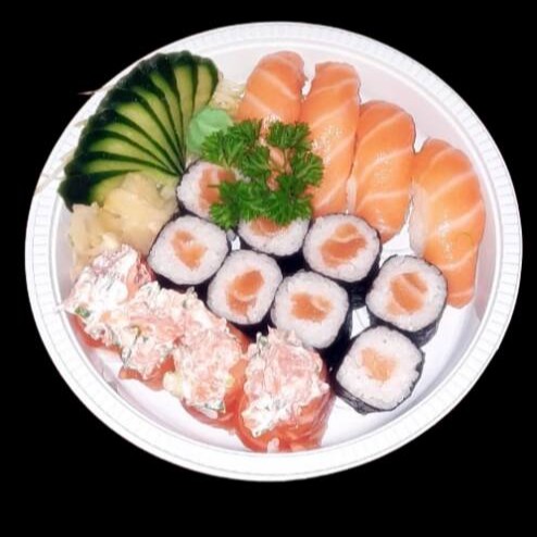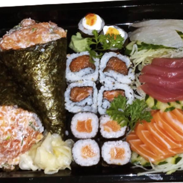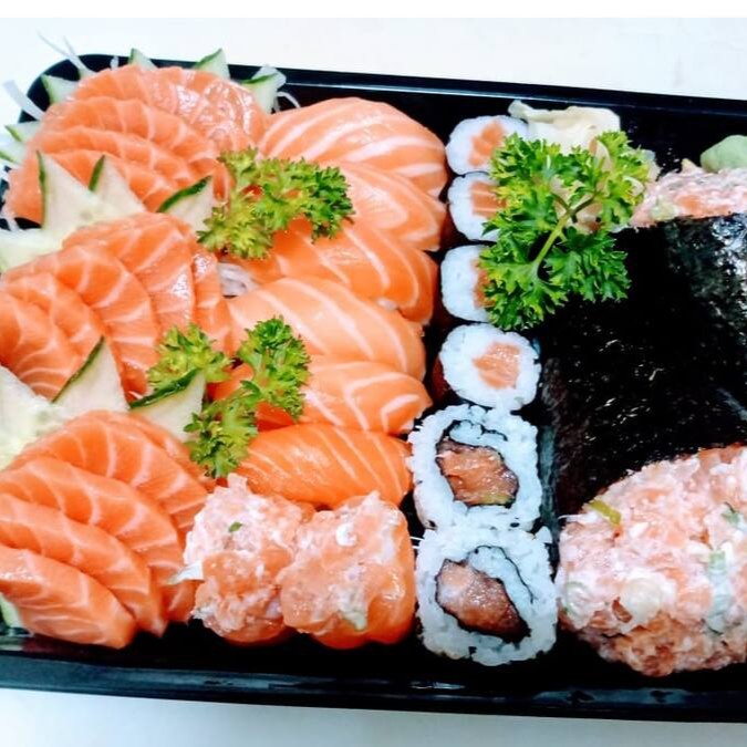 15 fatias de sashimi de salmão, 6 niguiris de salmão, 2 temaki Philadelphia, 1 dupla de jow e ,2 uramaki 4 hossomaki
