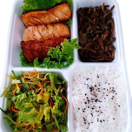 Salmao, shimeji, arroz branco e salada de folhas